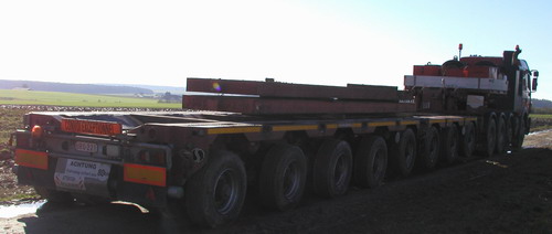 Aufgesattelt war ein achtachsiger Scheuerle Prismenroller mit Pendelachsen.