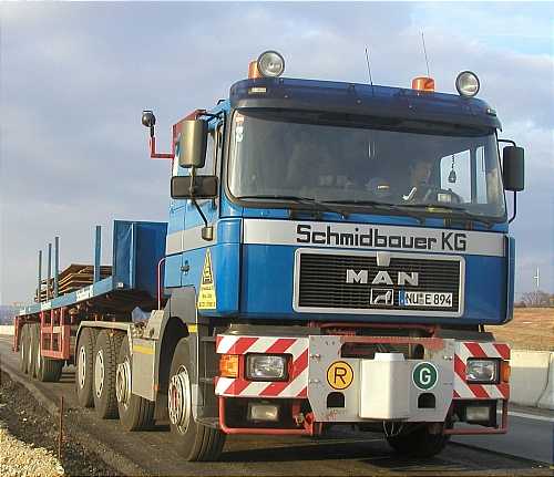 Um eine ausreichende Befestigung des Untergrundes zu Erreichen, wurden Stahlplatten verlegt. Diese befanden sich bereits auf einem in der Nähe geparkten Auflieger, der dann von dieser MAN F90 Schwerlastzugmaschine abgeholt wurde.