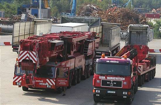 Der Demag AC 1600 von Markewitsch und ein Begleit-LKW mit Ballastanhänger. Im Hintergrund sind mehrere Sattelzüge für den Transport von Kontergewichten des Raupenkranes.