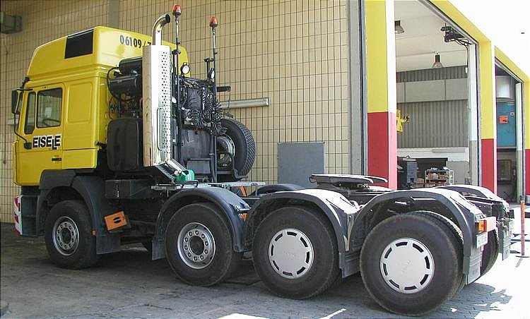 Der Fuhrpark umfasst mehrere Schwerlastzugmaschinen, hier eine MAN 41.464 / FE460A.