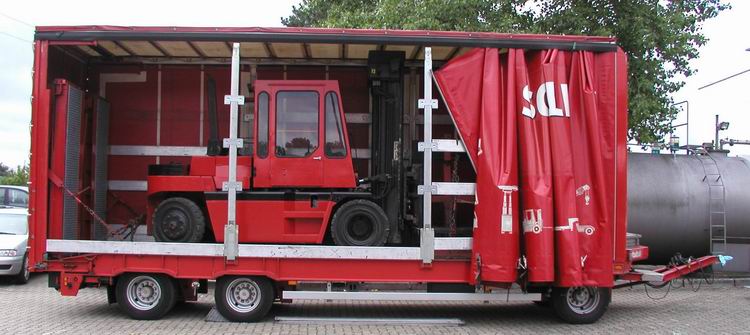 Unter der Plane des Anhängers verbirgt sich ein Gabelstapler.