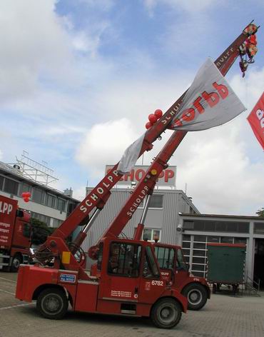 Bilder vom Besuch der Ettlinger Niederlassung der Firma Scholpp am Tag der offenen Türe. Hier ist ein Demag AC 40 City zu sehen. Im Hintergrund befinden sich Gittermastteile der Demag CC 2500.