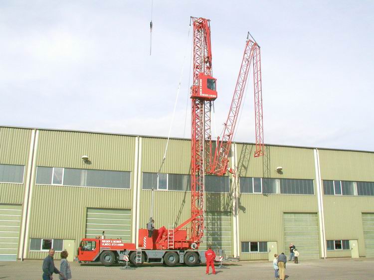 Nachdem der MK 80 einsatzbereit war, holte er die Spitze hinter der Halle hervor, und die Montage am LTM 1100/2 erfolgte.