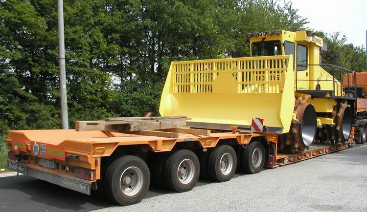 Hier ist zu sehen, daß das Planierschild den Tieflader seitlich überragt.
