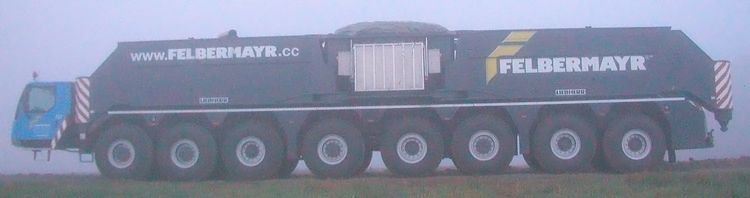 Die Heckansicht des Kranes. In der Mitte zwischen den beiden Stützen befindet sich eine Videokamera, die dem Fahrer ein leichteres Rangieren des Kranes ermöglicht.