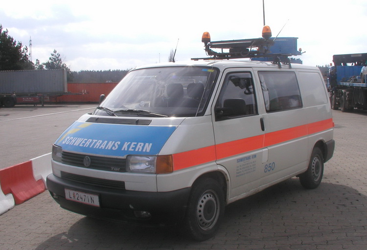 Zur Absicherung der beiden Fahrzeuge wird dieser VW T4 eingesetzt, der wie ein Teil des Kranballasts mit Schwertrans Kern beschriftet ist.