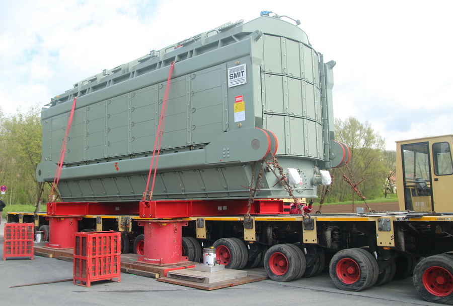 Mit vereinter Kraft wurden die Goldhofer THP Achslinien mit dem 260 Tonnen schweren Transformator vom Ponton die Rampe hoch bewegt.