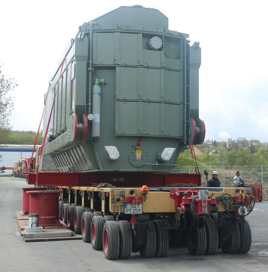 Nachdem die Achsen unter dem Trafo platziert waren, konnte die Zugmaschine wenden und in Fahrtrichtung vor den Anhänger gekuppelt werden.