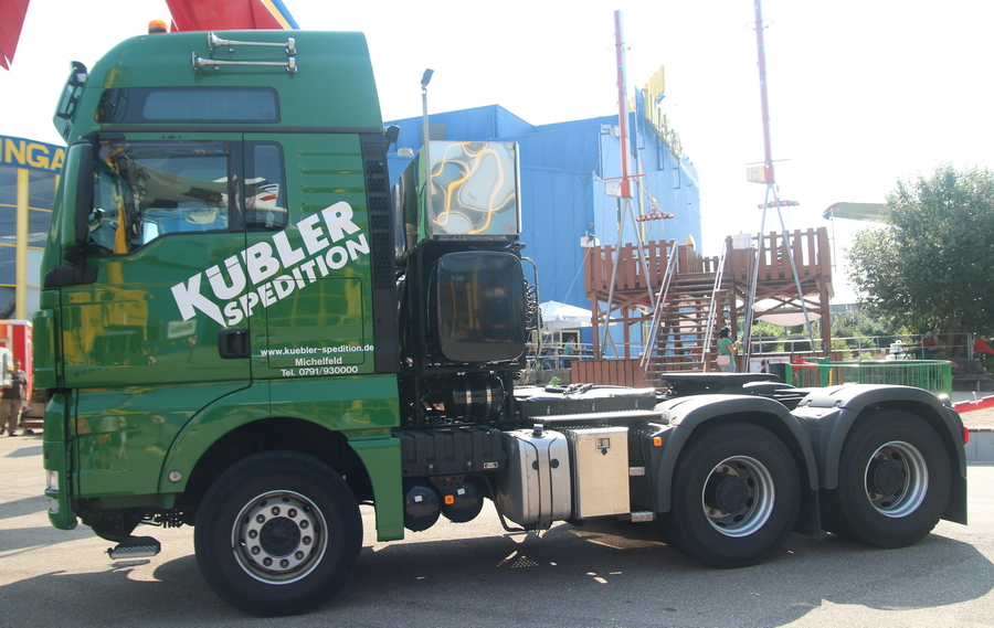 Der dreiachsige MAN TGX XXL 41.540 hat seinen Kraftstofftank hinter der Fahrerkabine. Auf der Baifahrerseite wurde stattdessen eine Staukiste verbaut.