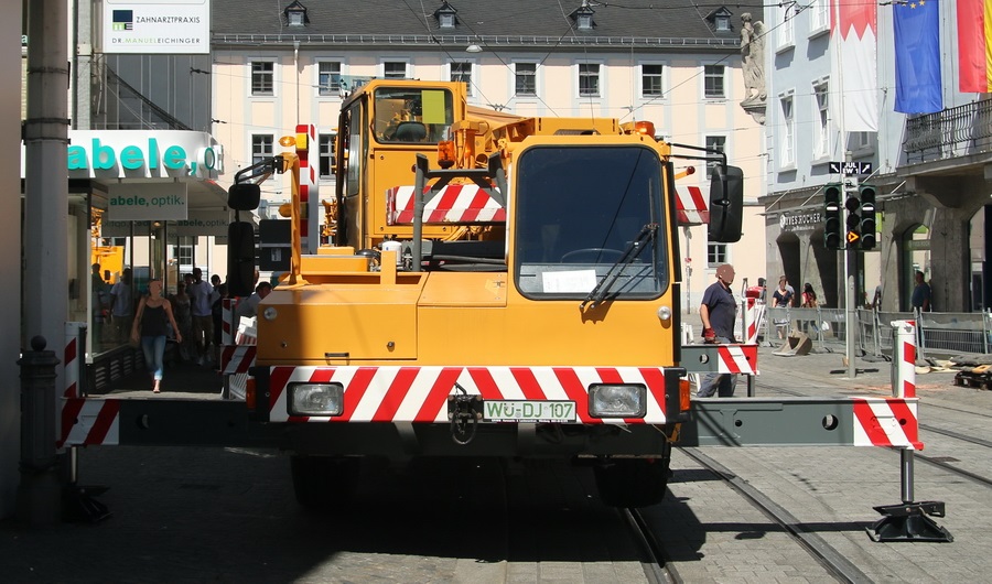 Beim Austausch von Weichen der Würzburger Straßenbahn wurden zwei Krane des Würzburger Kranverleihs eingesetzt.
