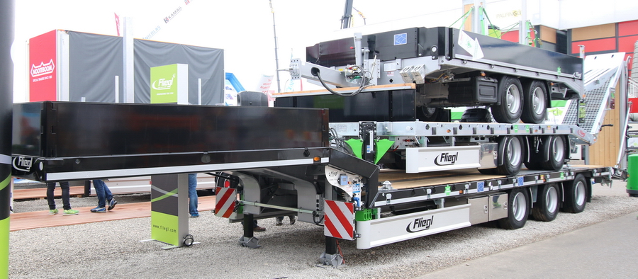 Bei Fliegl gab es den dreiachsigen Semiauflieger SDS 470T zu sehen, der mit zwei Anhängern beladen war.