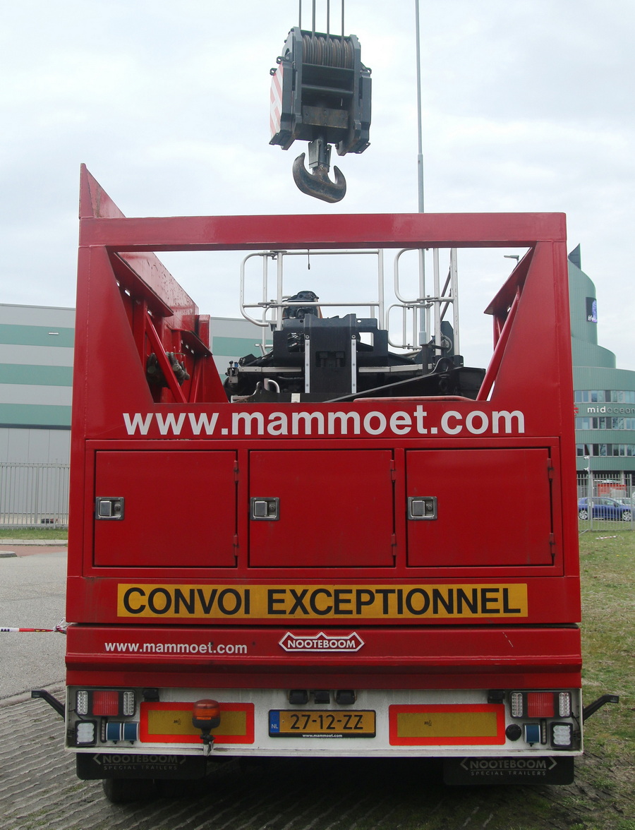 Auf dem Schwanenhals des siebenachsigen Semiaufliegers des Herstellers Nooteboom befindet sich ein Materialcontainer.
